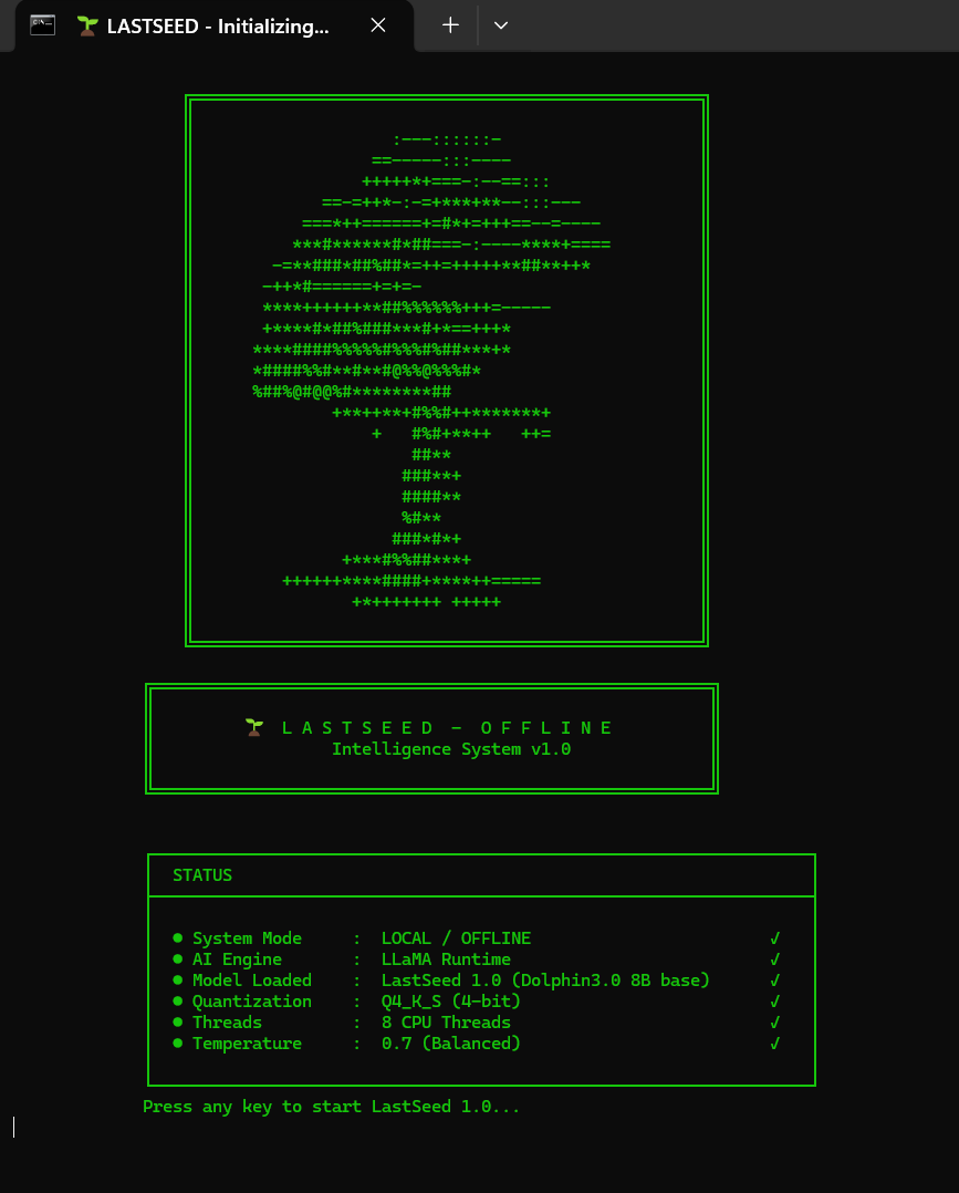 Please note: LastSeed is a powerful offline AI designed primarily for survival and critical scenarios. However, it is not as advanced or versatile as cloud-based models like ChatGPT. While we strive for accuracy, the AI may occasionally provide incorrect or incomplete information, users should always verify critical data independently.